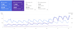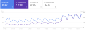 In the period from 1 August to 27 August, the number of clicks on the blog grew to 7,120 compared to 986 in July. Impressions increased from 21,700 to 206,000. The average CTR dropped from 4.5% to 3.5.