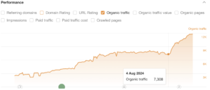 This graph shows a sharp increase in organic traffic to the site starting from August 4, 2024, when the traffic was 7,308 visitors. This increase coincides with the implementation of 301 redirects from other sites and giving access to the blog to all users, which was presumably the reason for such a rise in site visits. This significant traffic growth indicates the success of changes.