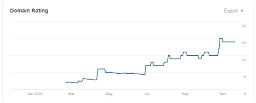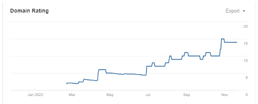 - Domain Rating (DR) growth, which demonstrates the effectiveness of the link-building strategy and increase in the number of quality backlinks