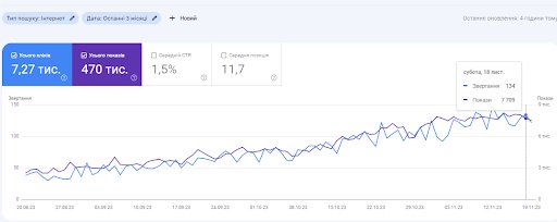 In just 28 days, between 23 October 2023 and 19 November 2023, the website received 3,260 clicks and 207,422 impressions (The organic traffic doubled for the last 4 months)