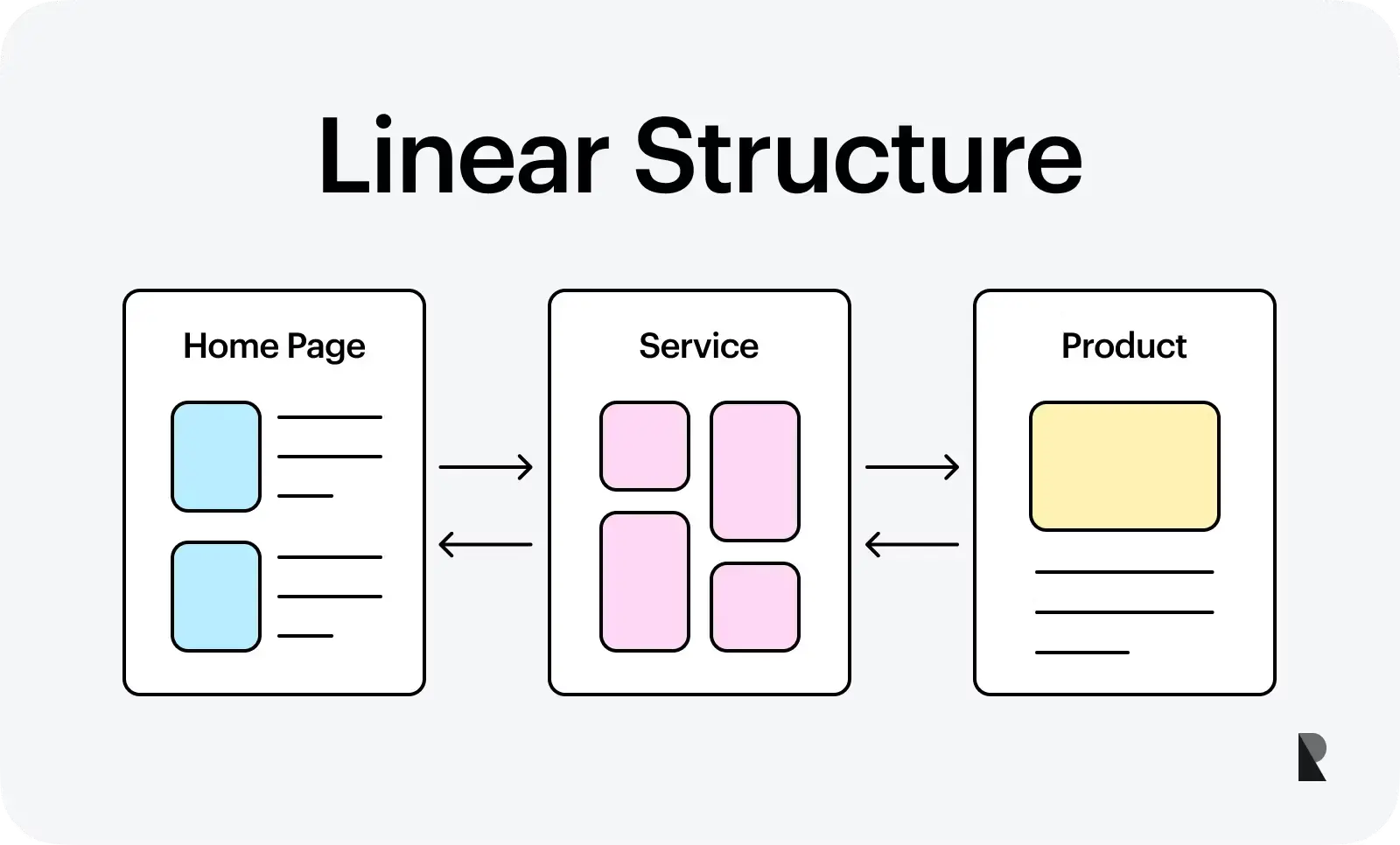 Linear or sequential. The optimal choice for landing pages and sites with a simple user path. A linear structure is often used for corporate pages and “business card” sites that give visitors basic information about the business.