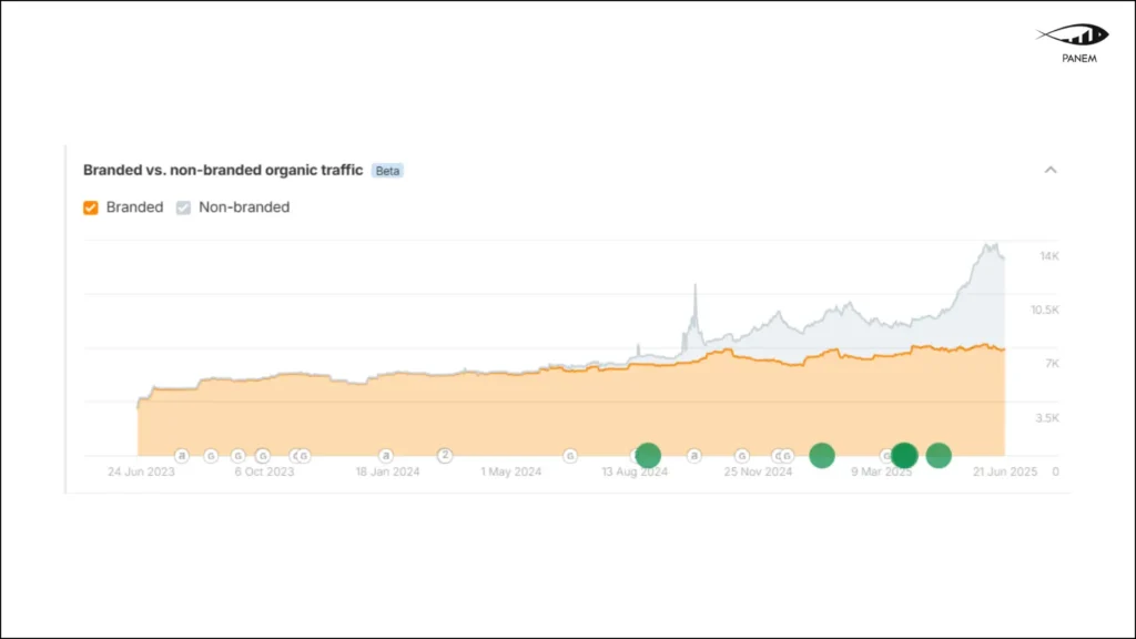 - Non-branded traffic growth significantly outpaced branded — confirming the success of content-focused SEO