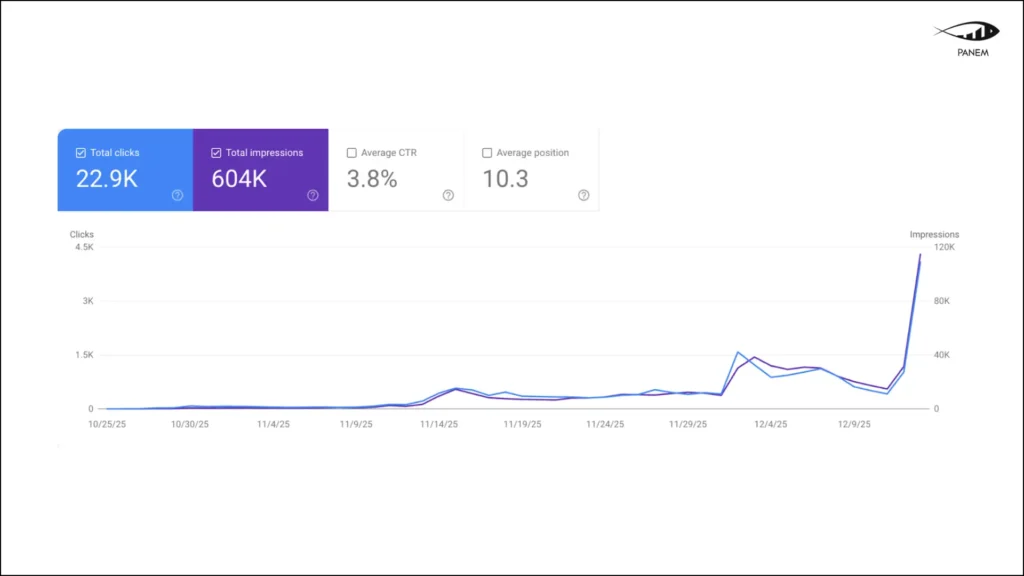The data clearly shows a strong upward growth trend starting shortly after launch, with a sharp increase in both impressions and clicks toward the end of the analyzed period. This confirms fast indexation, growing visibility, and increasing organic demand across multiple keywords.